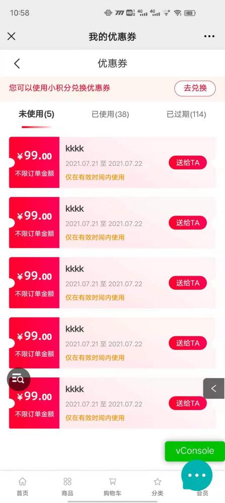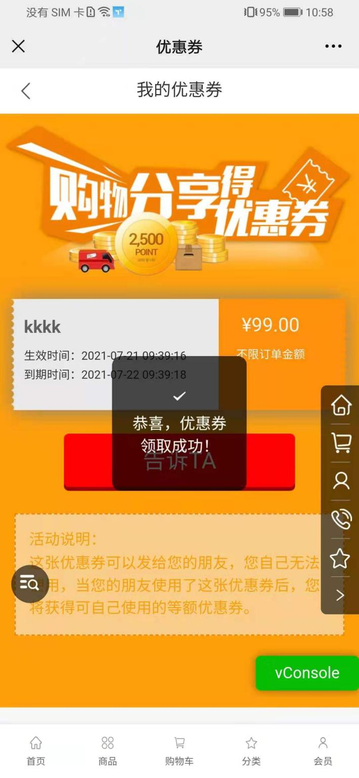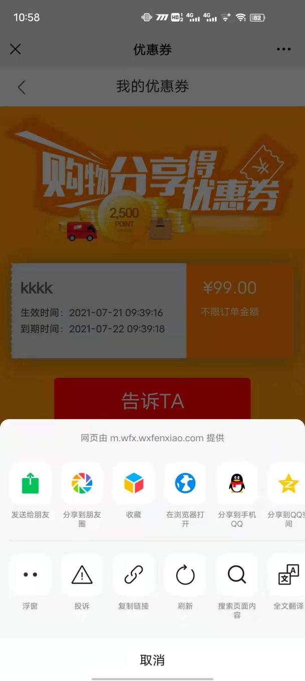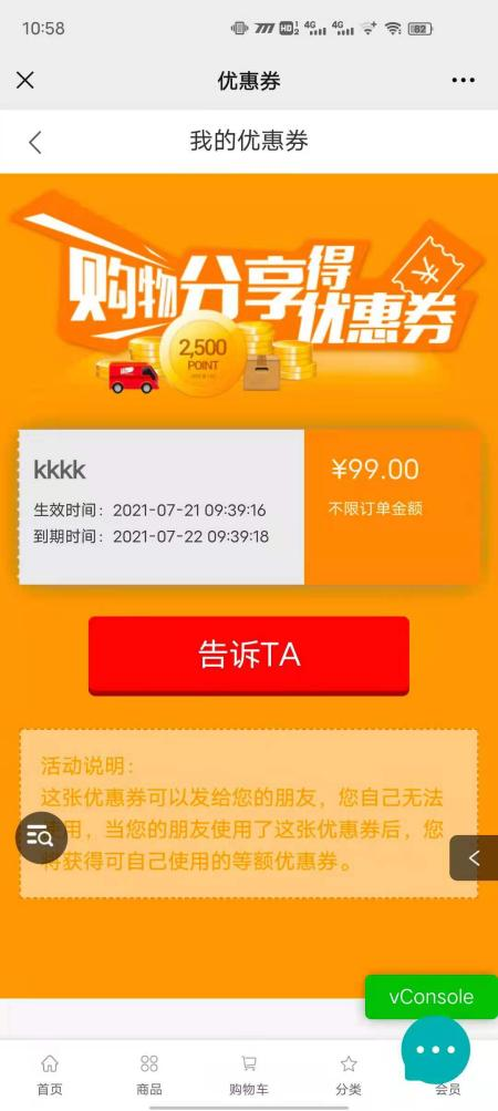 用戶場景:購物分享得優(yōu)惠券活動,在小程序優(yōu)惠券點擊送給TA可以正常使用