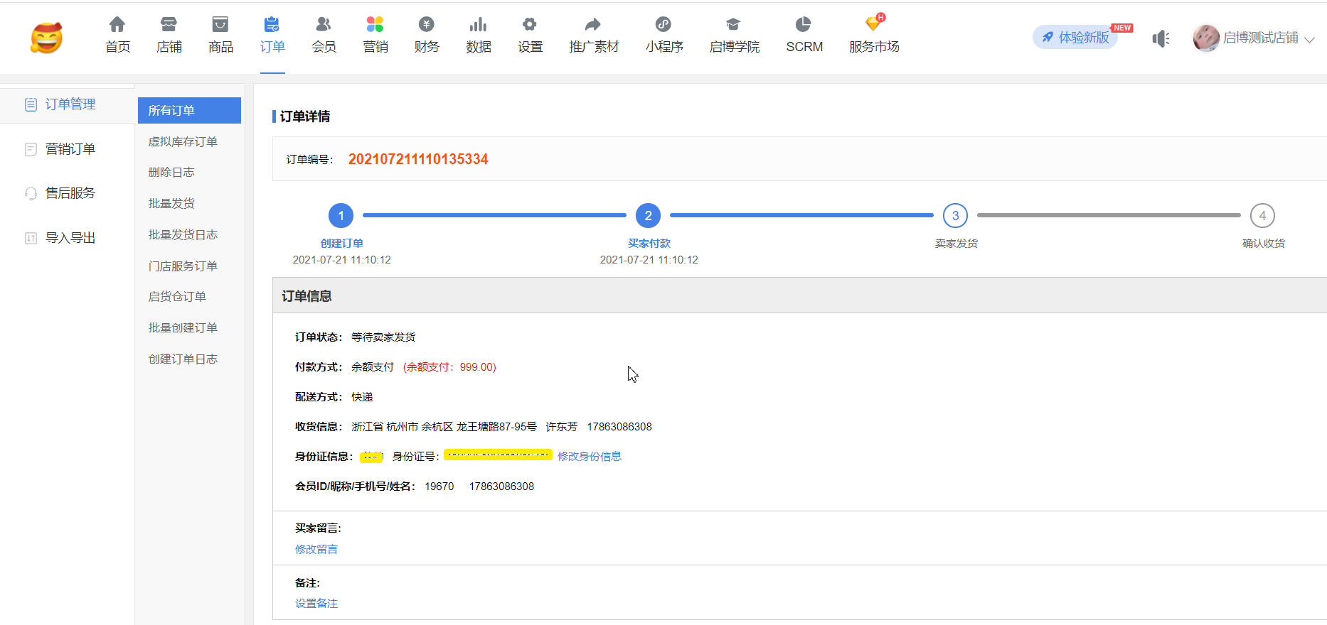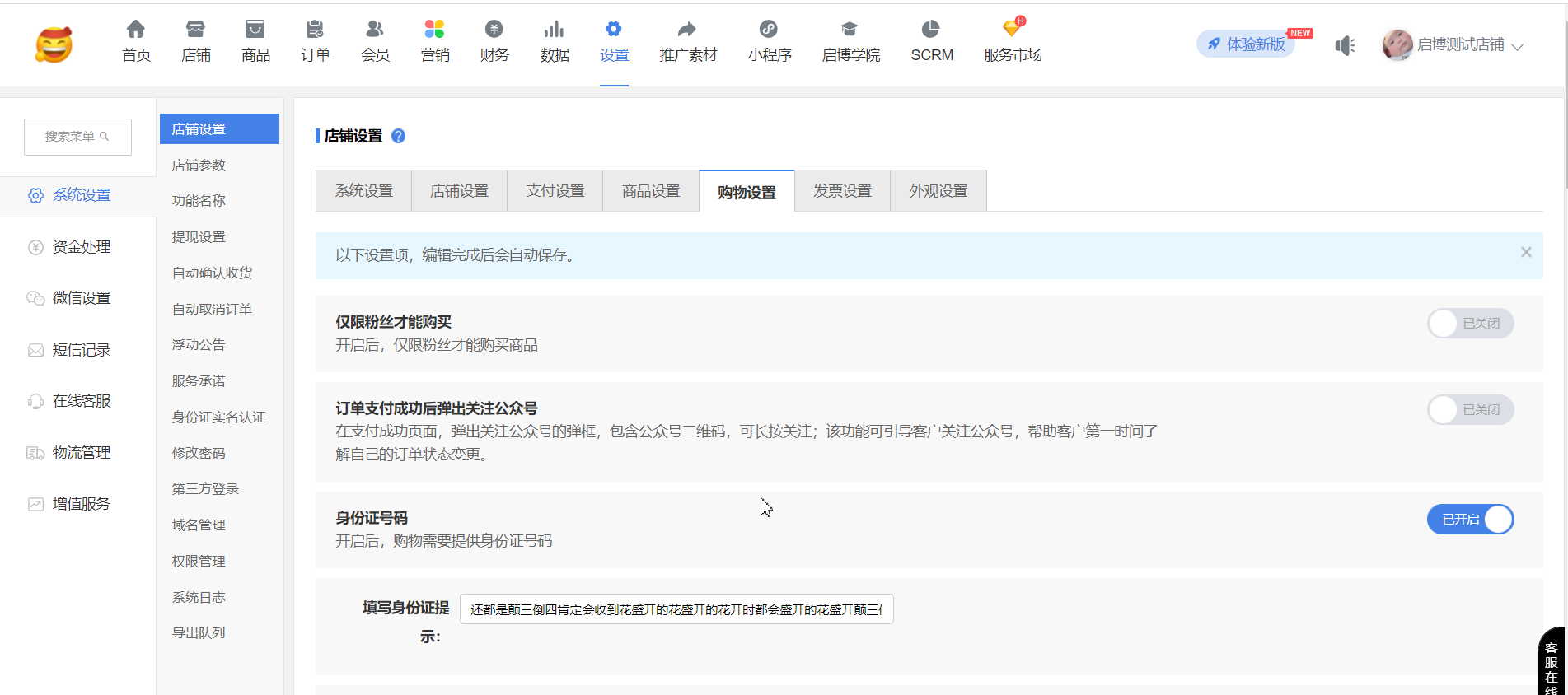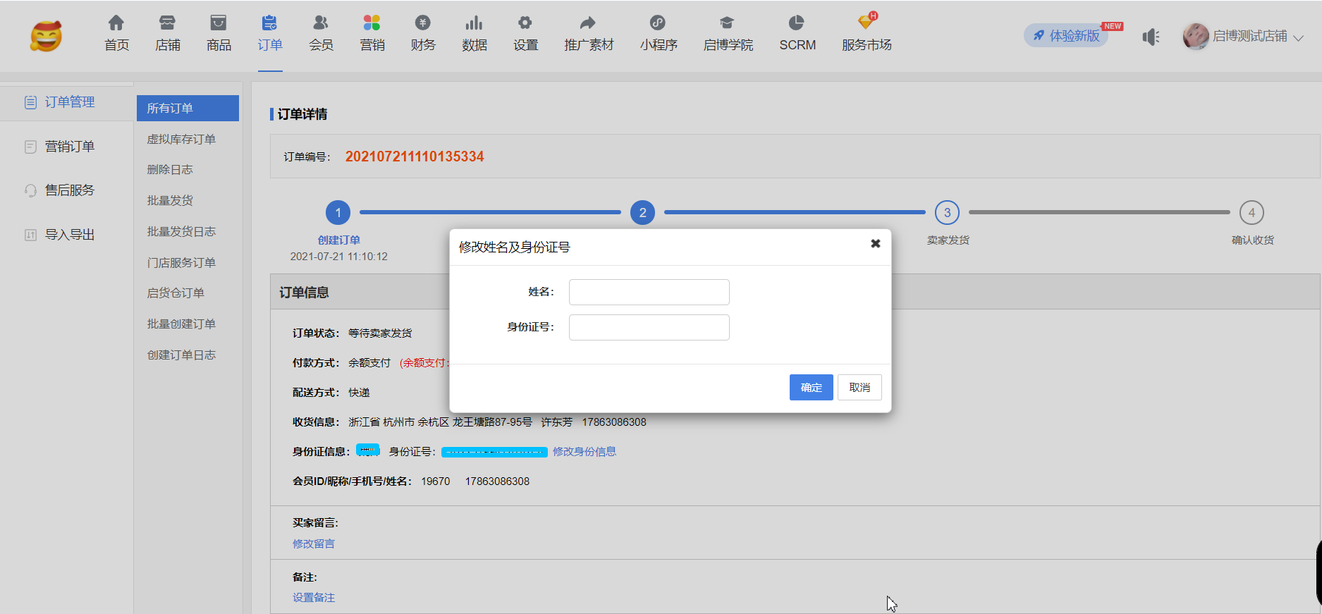 用戶場景:系統(tǒng)設置-店鋪設置-開啟”跨境電商模式”、”身份證號碼”;同時,系統(tǒng)設置-“身份證實名認證”,”是否開啟身份證實名認證”和”是否驗證訂購人姓名”開啟后,在手機端訂單詳情可以修改”訂購人”信息,后臺訂單詳情同步修改后”訂購人”信息。