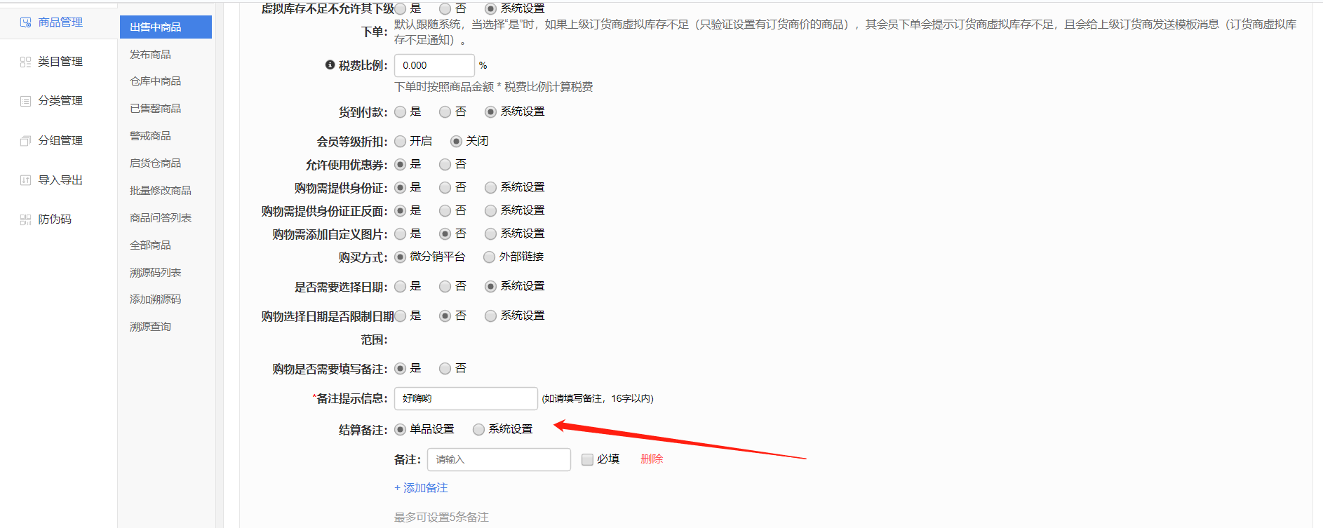 現(xiàn)邏輯:商品購物設置-新增“結算備注”設置,支持針對單品設置還是走系統(tǒng)設置
