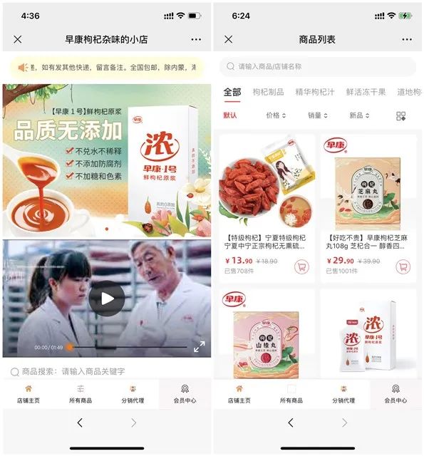 早康枸杞的線上商城共有2個,分別為微商城和小程序。商城價值:實現轉化復購,提升用戶留存。早康枸杞推出創新型“O2O+F2C”模式購物商城,功能包括店鋪首頁、所有商品、分銷代理和會員中心;小程序和微商城主要承接用戶的首購和復購,是品牌在私域里的核心轉化工具。