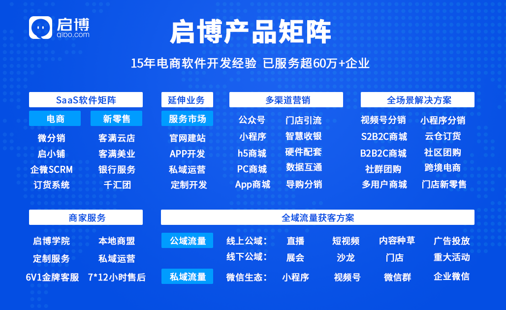 隨著微信電商基礎設施不斷完善,啟博已擁有15年的電商軟件開發技術經驗,啟博自開發的微分銷商城系統可以為企業品牌提供從獲客、連接到轉化、維系的全鏈路解決方案與服務。