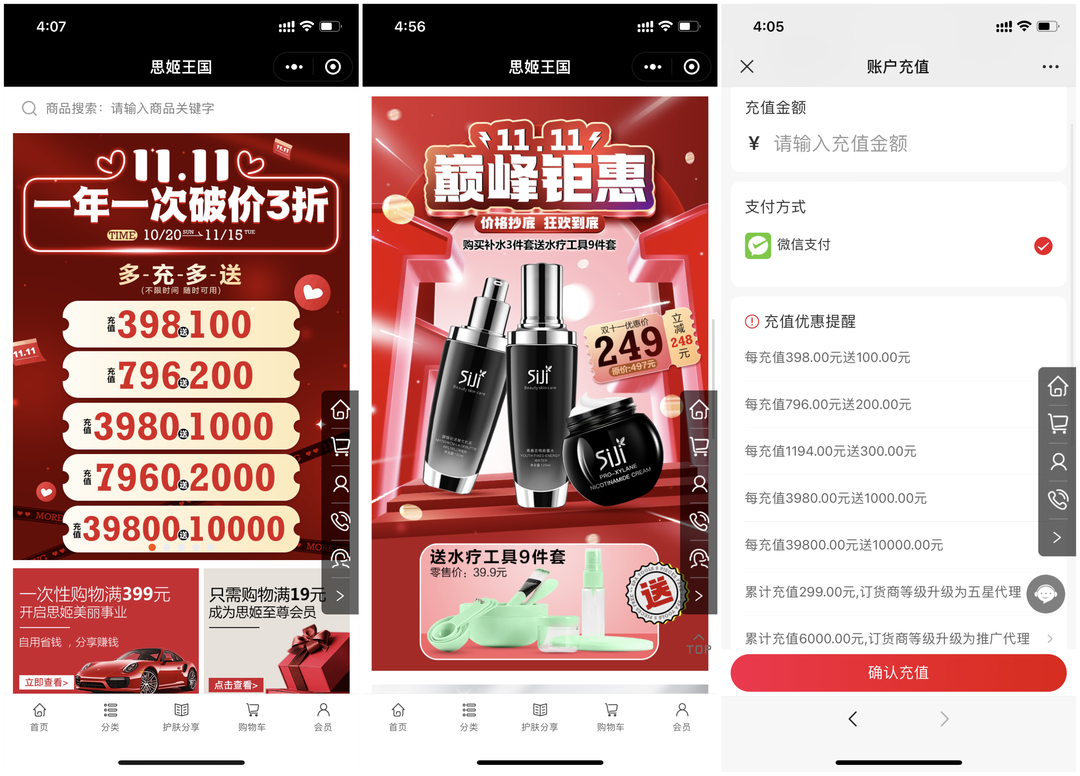 小程序商城會員充值返現。結合會員充值功能,會員充值398元送100元/充值796元送200元/充值3980元送1000元,多充多送。