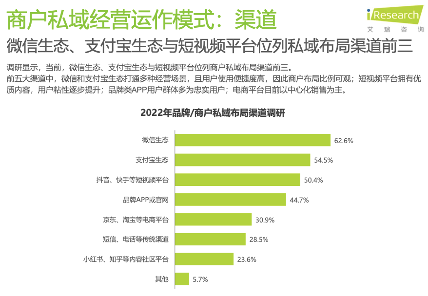 艾瑞的調(diào)研顯示,微信、支付寶和抖音等短視頻平臺成為私域布局前三大渠道。