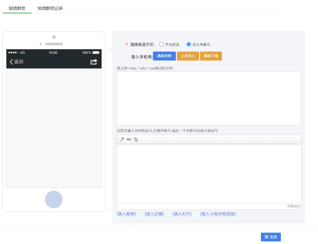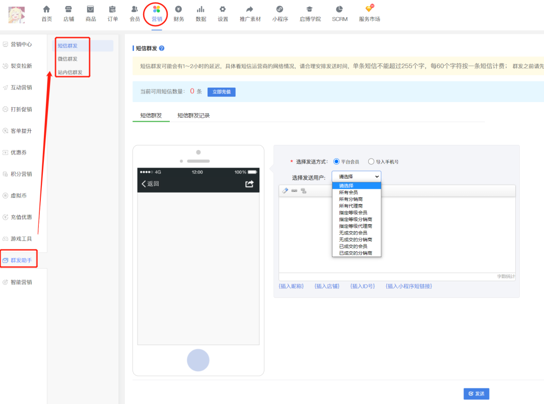 ① 短信群發(fā):以短信的形式發(fā)給商城內(nèi)的會員、分銷商、代理商、訂貨商等用戶,也可以導(dǎo)入手機(jī)號到平臺內(nèi),將短信發(fā)送給這批自定義用戶;