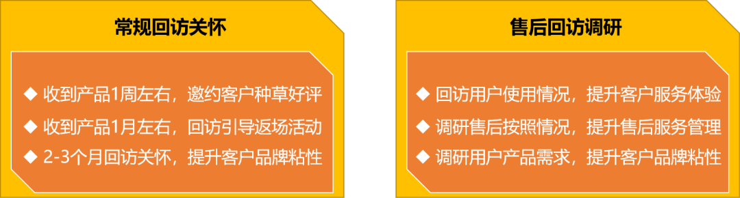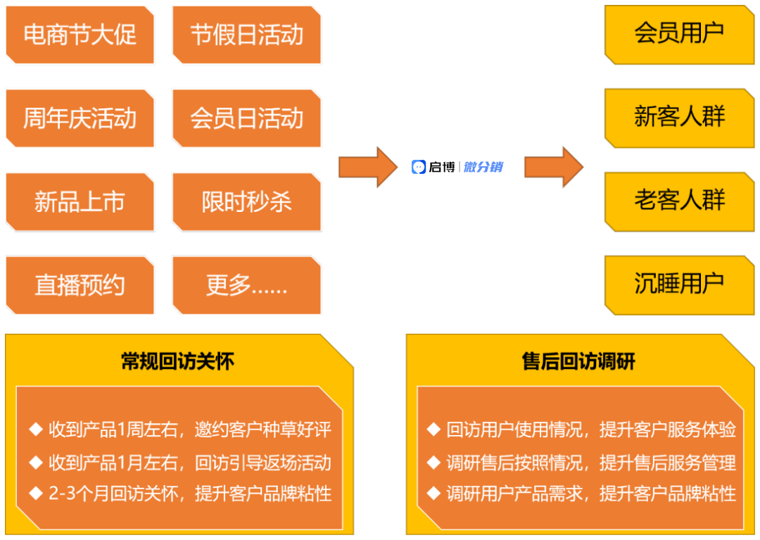 在用戶購買產(chǎn)品后,做邀約用戶種草好評、引導(dǎo)返場活動、回訪使用情況、調(diào)研產(chǎn)品需求等環(huán)節(jié),提升用戶服務(wù)體驗和品牌粘性。