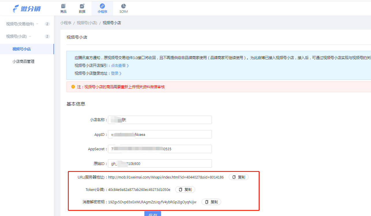 AppID &AppSecret:在視頻號小店-服務市場-自研中獲取