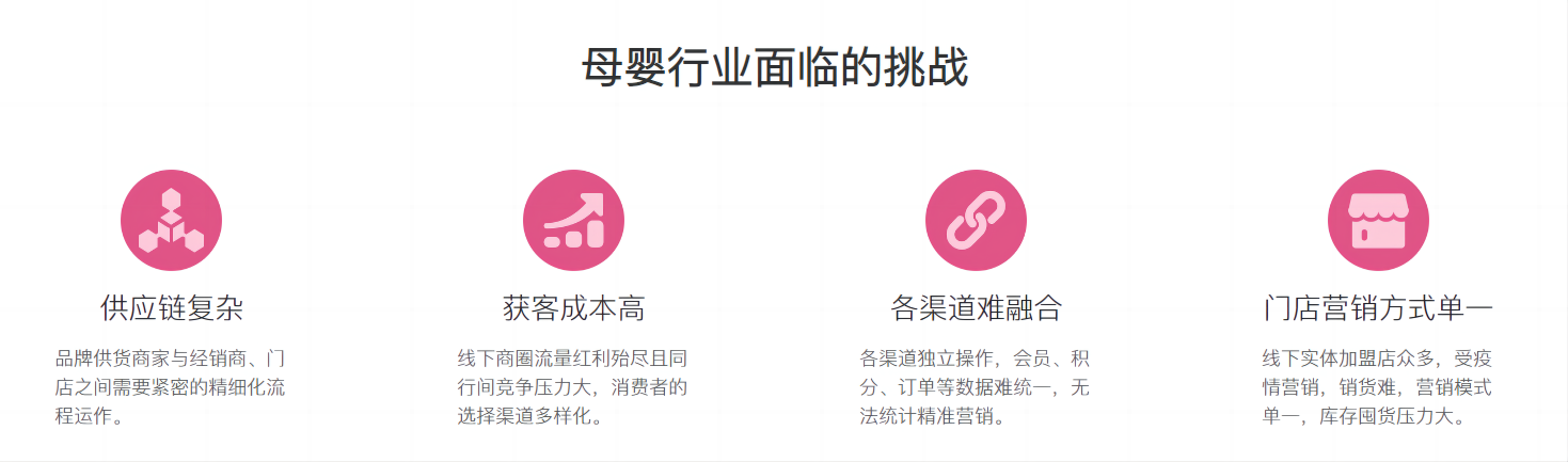 母嬰店開店成本較高,如:店租、管理與營銷運營等都是開母嬰店需要考慮的前期投入。而且現有的母嬰門店同質化嚴重,門店競爭激烈。門店管理方式傳統、營銷模式單一等多種因素,導致母嬰門店獲客難、留存難。