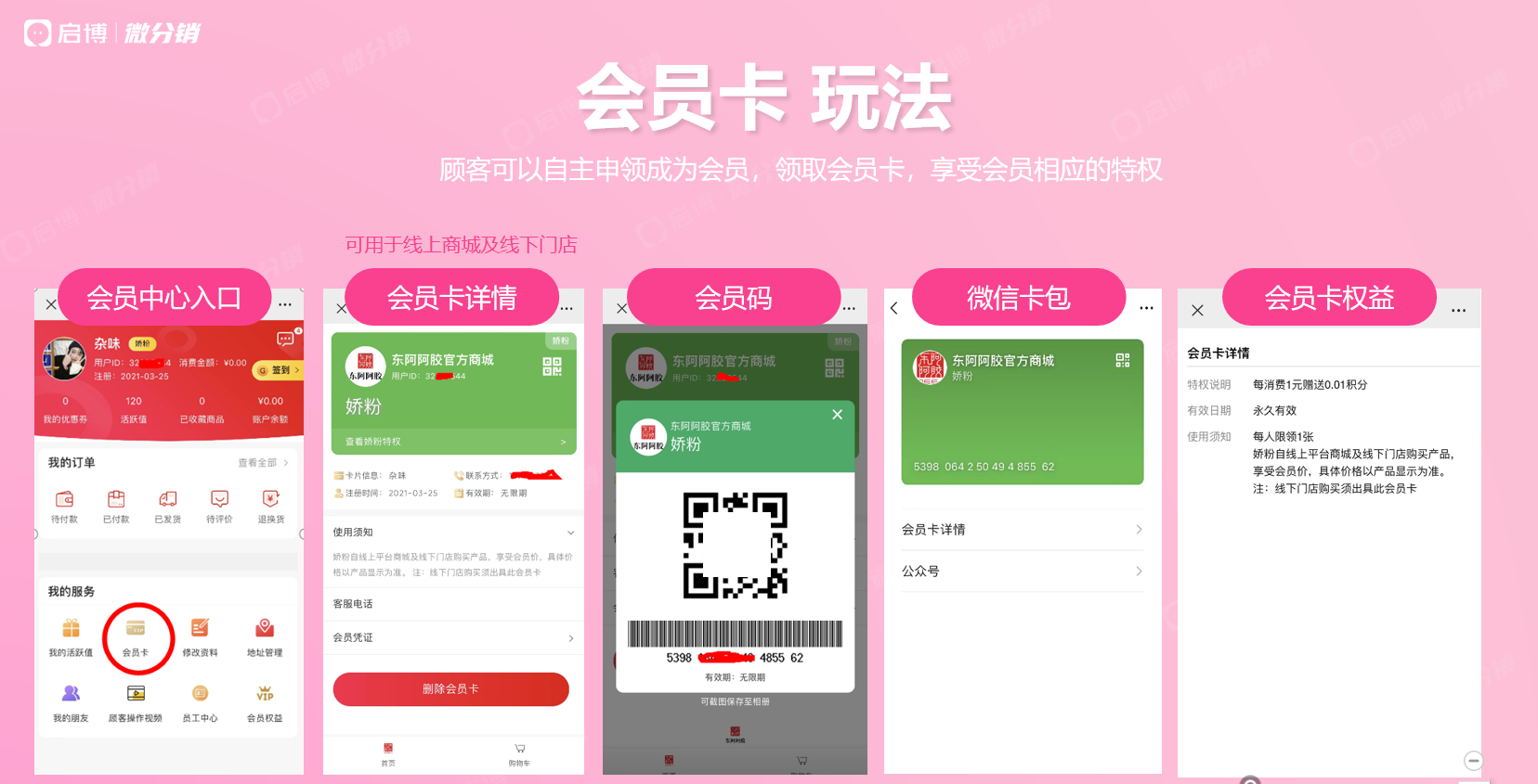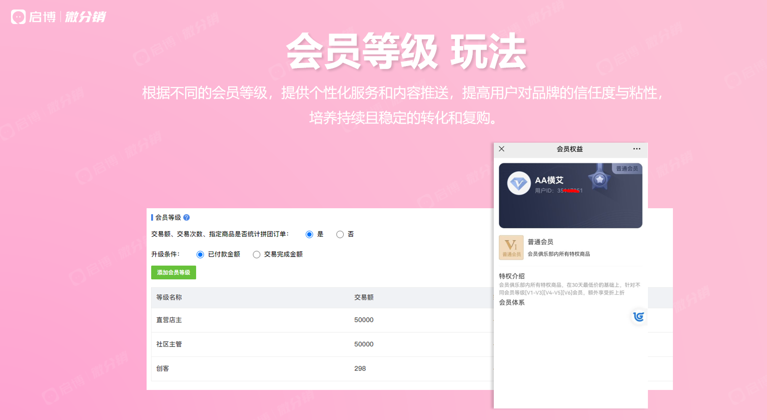 啟博微分銷商城系統可全渠道觸達顧客,搭建全鏈路會員體系,實現全域會員運營。幫助門店聚合朋友圈、社群、視頻號、企業微信等流量進行精準運營,并無縫對接門店收銀,幫助門店打造線上線下一體化會員體系。