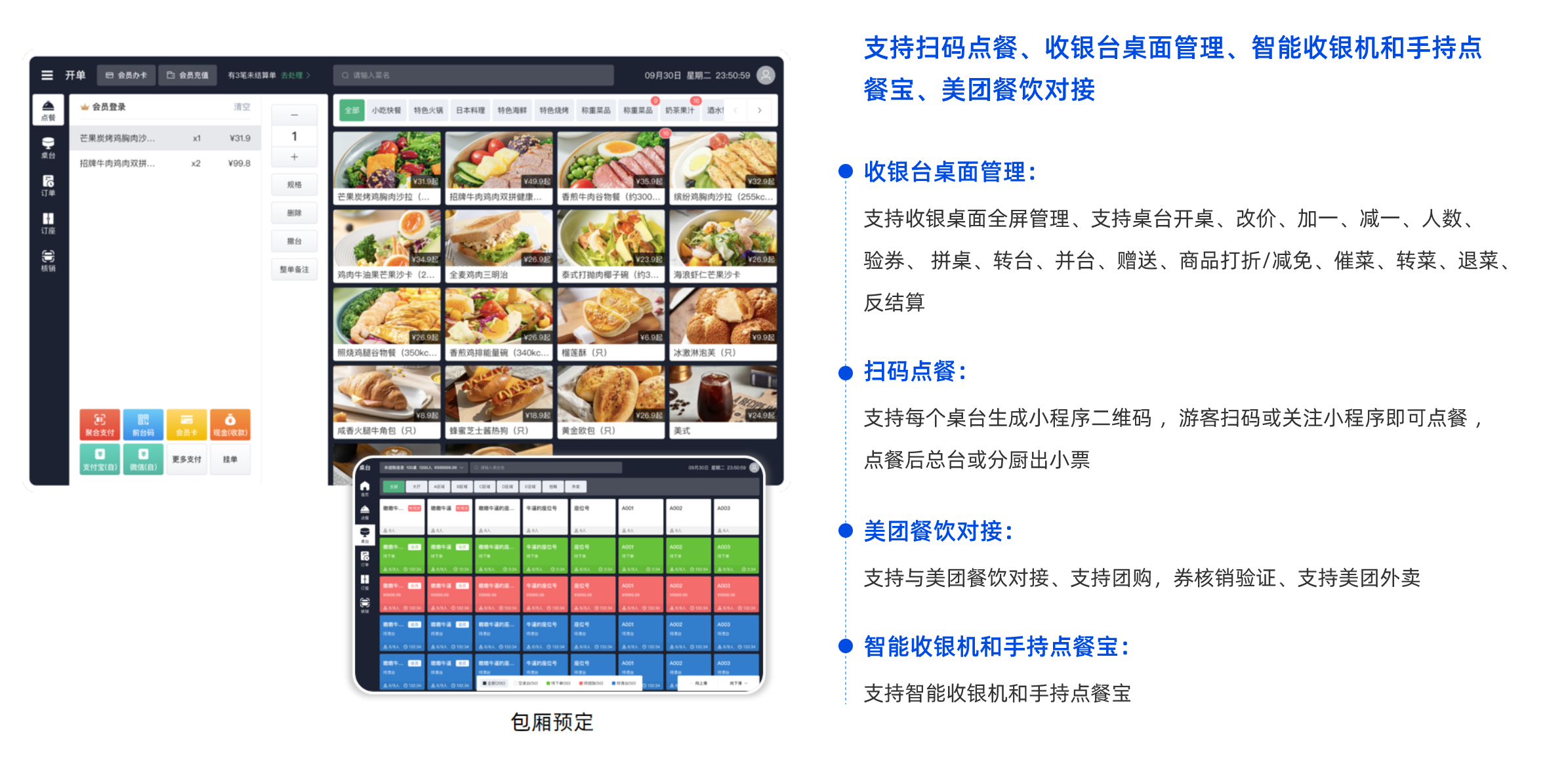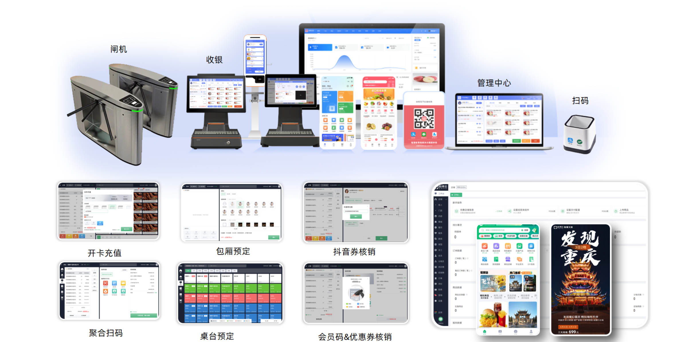 支持多個門店收銀、支持門票、 實物、 餐、 房間、 卡五種業(yè)態(tài),支持支付寶、 微信、 拉卡拉、 現(xiàn)金、 儲值卡等收銀