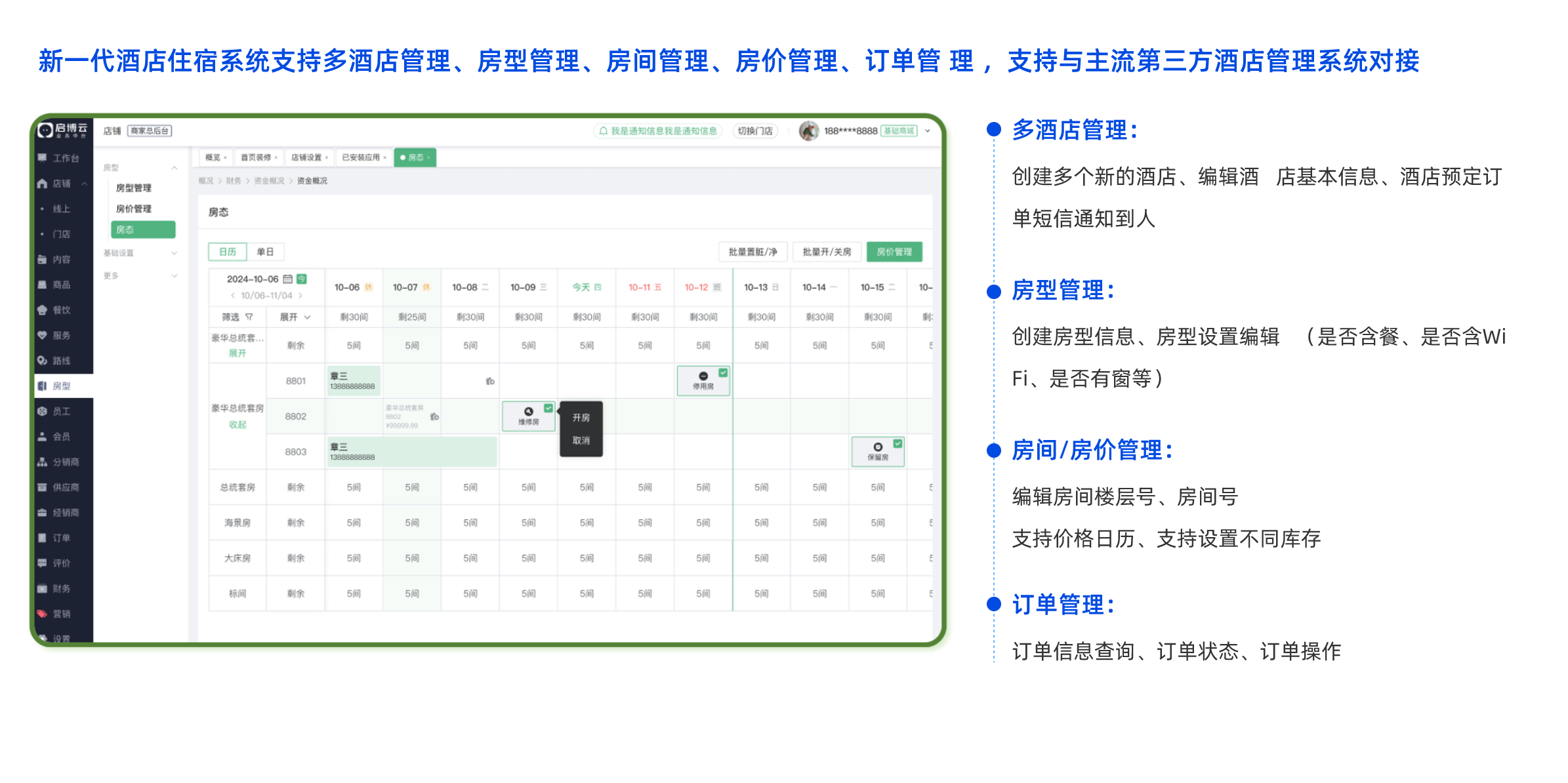 支持建立多個酒店商戶 ,每個商戶支持酒店管理、 房間管理、 房型管理、 美團(tuán)等OTA對接