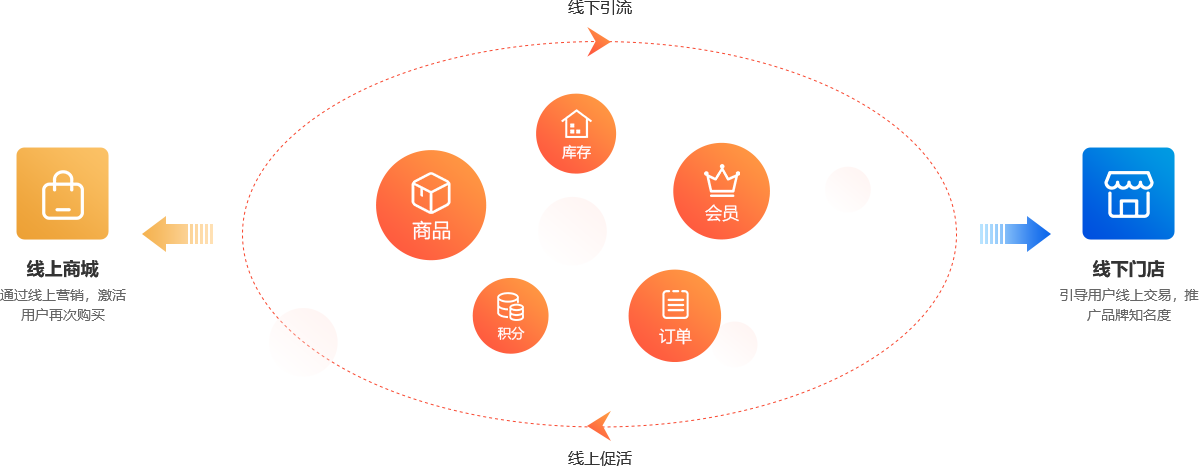打通線上線下門店銷售,同步門店商品、庫存、會員、積分、訂單,形成流量閉環(huán),幫您成功實現(xiàn)傳統(tǒng)門店轉型
