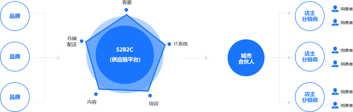 通過供應(yīng)鏈平臺(tái)(S),提供海量貨源給到渠道商 / 采購商(B),結(jié)合互聯(lián)網(wǎng)技術(shù)